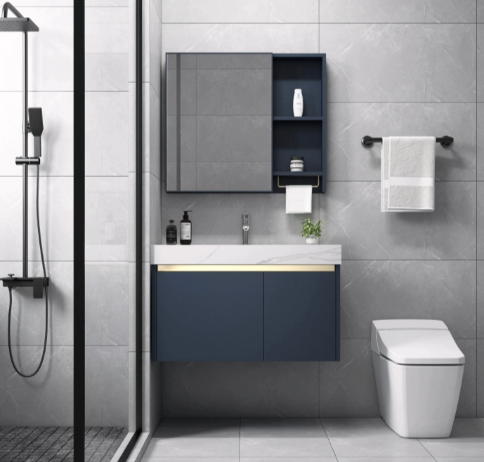 | Tủ chậu Lavabo | Thiết kế treo tường (Floating), mặt bàn đá, chậu sứ Nano. |